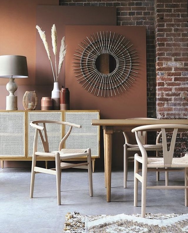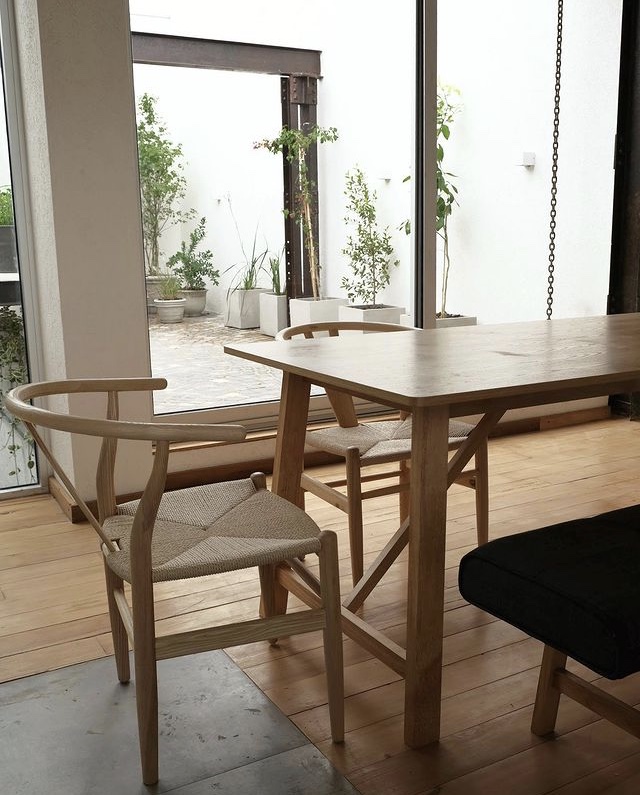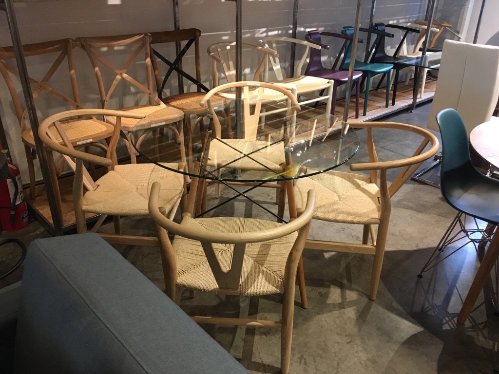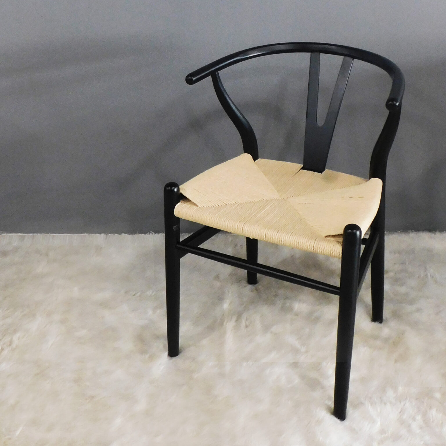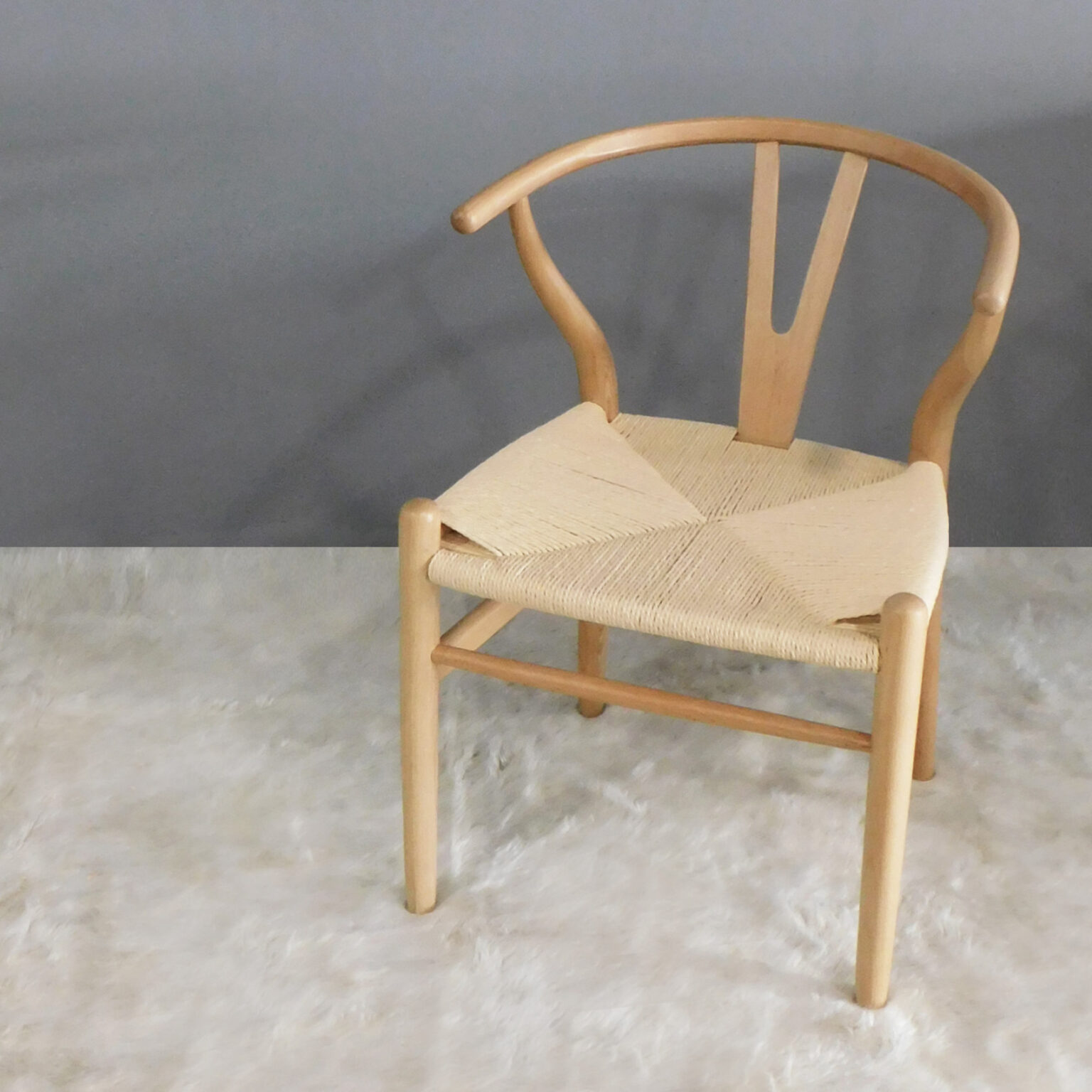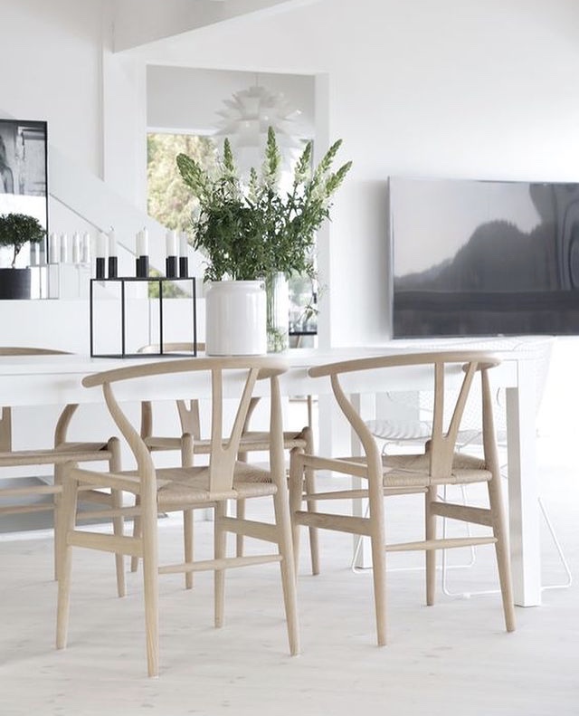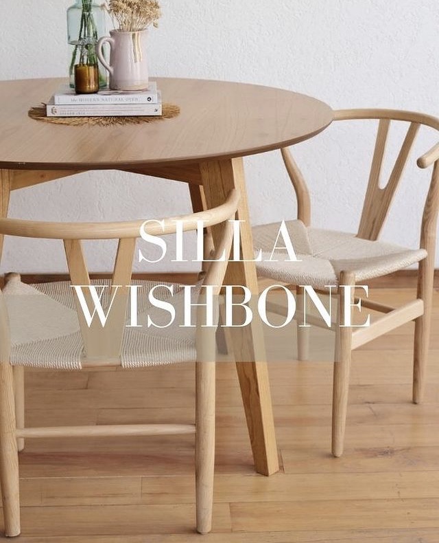 Silla Wishbone diseñada por Hans Wegner. Creó esta serie en 1949 inspirándose en los retratos de los comerciantes daneses que posaban sentados en asientos de la dinstía Ming. Su nombre «Wishbone» lo que nosotros llamamos «hueso de la suerte» viene del hueso fúrcula, del pollo. Esto se debe, ya que el resplado de esta silla tiene la misma forma que este hueso. Fabricada en Madera de haya natural y asiento de ratán natural sintetico. La forma tan paritcular de esta silla, brinda un confort que no tiene ninguna otra. Su profundidad y sus apoyabrazos, permite relajarte como si estuvieras sentado en un sillón.